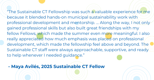 Fellows will gain valuable experience working within a professional setting and will be directly engaged in supporting cutting-edge ;sustainability initiatives, local government operations, and regional coordination and operation. Fellows will build a deep professional network that spans across local, state and regional government, as well as with nonprofits and organizations supporting sustainability initiatives in the state of Connecticut. Hear from former Fellows about their summer experience.